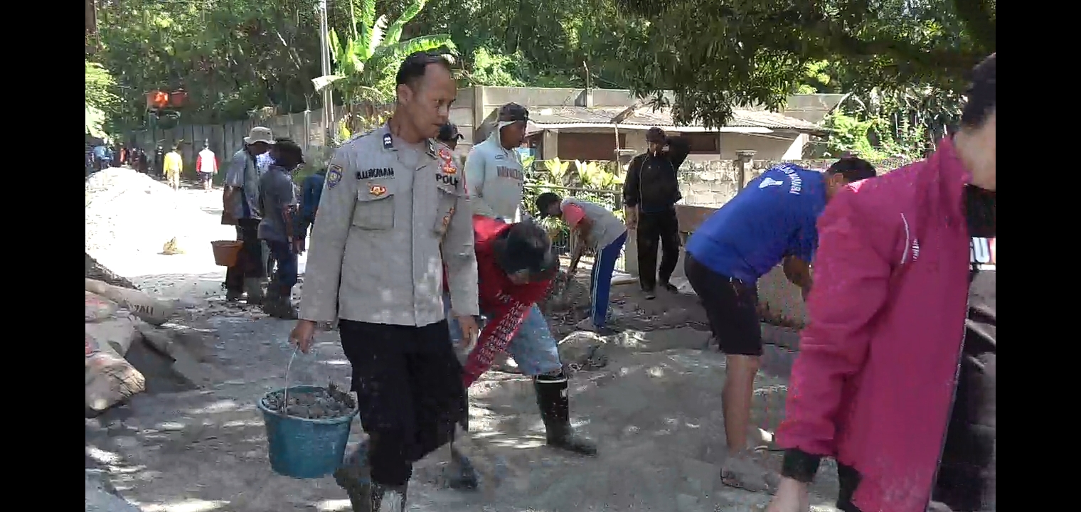 Aiptu Budi Lukman Nuryadin, yang bertugas selaku Bhabinkamtibmas di Wilayah Desa Cinta Mulya tidak hanya hadir menyaksikan masyarakat bahu membahu memperbaiki jalan yang telah rusak selama puluhan tahun namun dirinya juga turut serta mengangkat material berupa pasir, kerikil dan semen bahkan hingga memadatkan pengecoran dengan menggunakan kedua kakinya meski seragam kepolisian masih melekat pada tubuhnya.